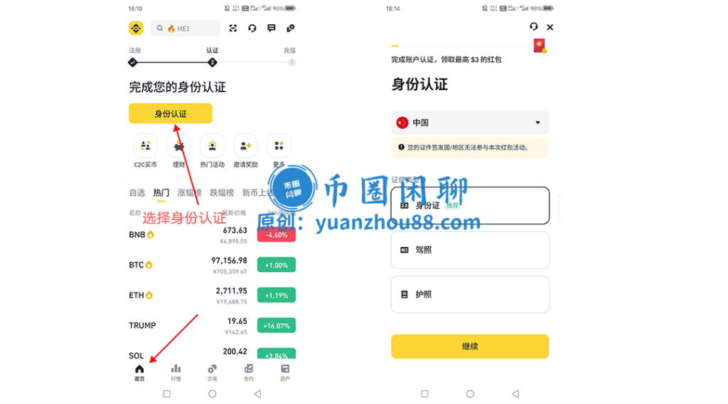 下载好交易所App后,使用刚才注册的账号进行登录,在首页点击身份认证,进入身份认证类型。在身份证、驾照、护照认证三种类型里,我们默认选择身份证,然后按照提示完成认证。