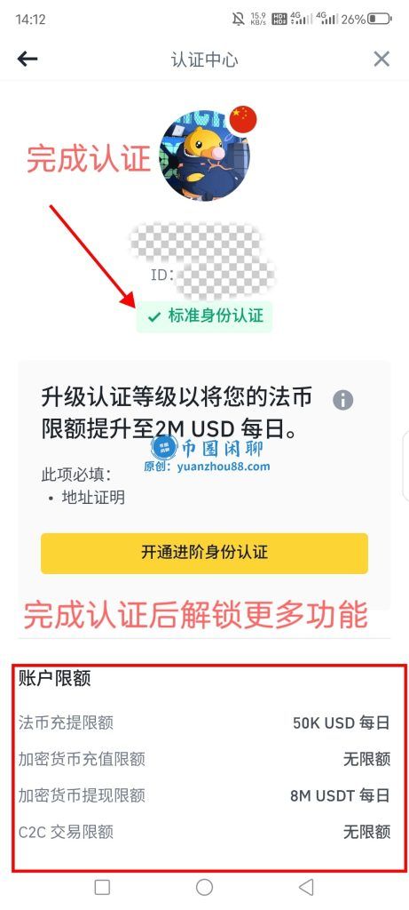注意:标准身份认证的法币每日限额为50K;你也可选择完成进阶身份认证,将每日限额提升至2M,从而获得更高的交易权限。