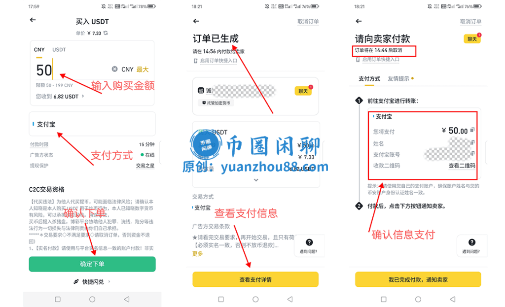 选择商家后,请在购买USDT页面输入购买金额与支付方式,点击“确认下单”;随后页面将跳转至订单已生成状态,此时点击“查看支付详情”即可继续操作。
