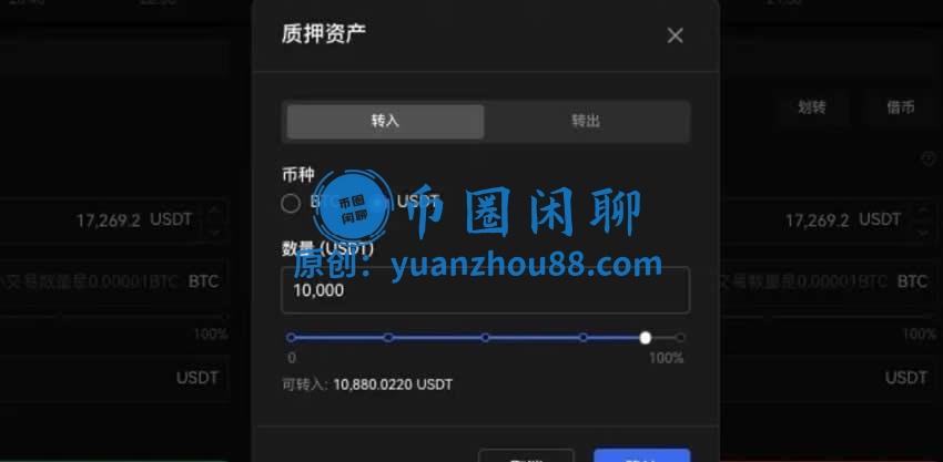 4、在“划转”栏输入您要从资金账户转入一键借币账户的金额,该金额将作为本次交易的质押品;本例中将划转10,000 USDT并点击“确认”按钮完成操作。