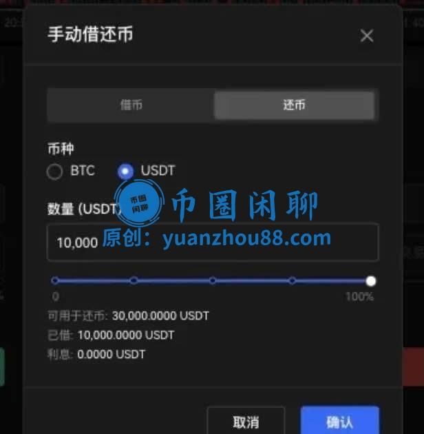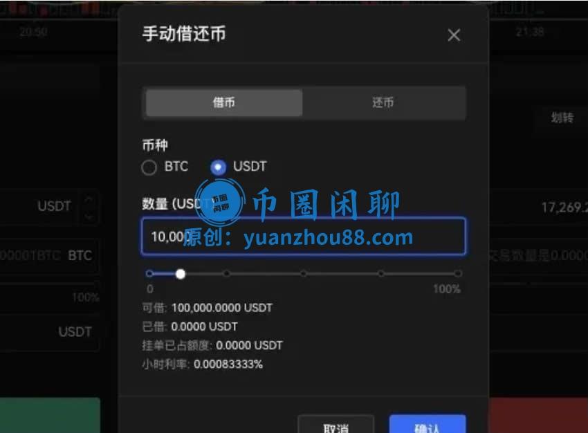5、在手动模式下,需确定借币数量:若需20,000 USDT完成交易且已从资金账户划转10,000 USDT,此时您将借10,000 USDT并点击”确认”。