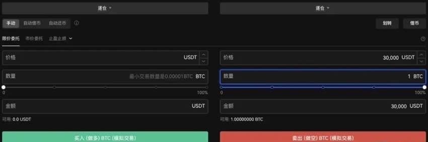 假设BTC价格已涨至30,000 USDT,为了清除做多仓位,您可以输入价格(USDT)和数量(BTC),然后选择“卖出(做空)BTC”来卖出BTC。
