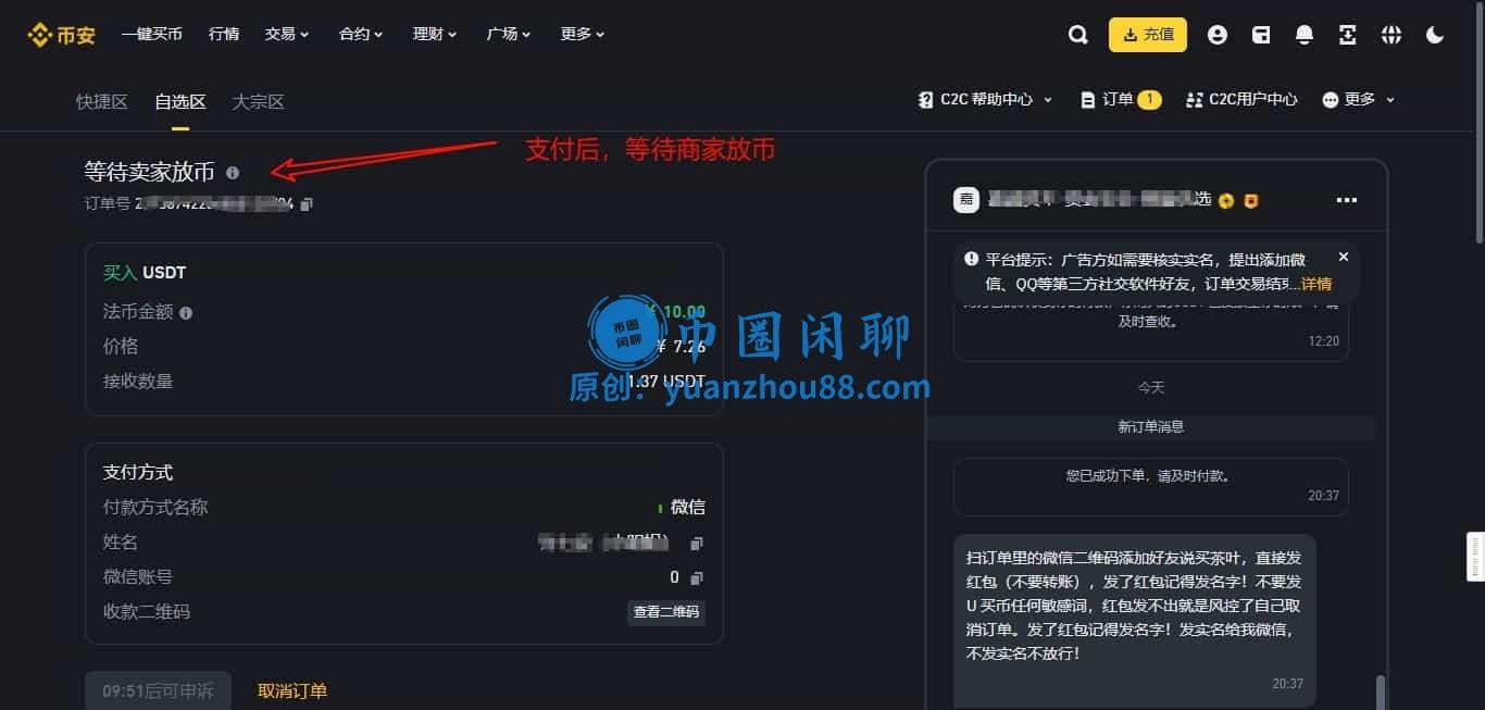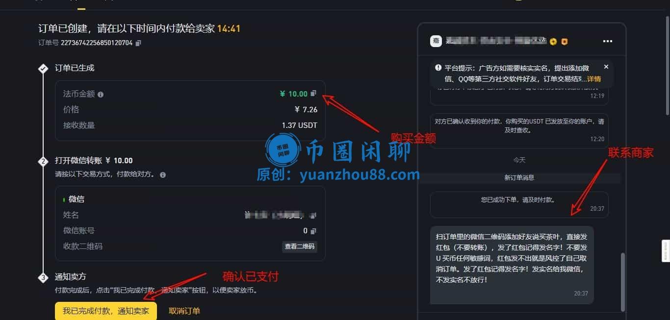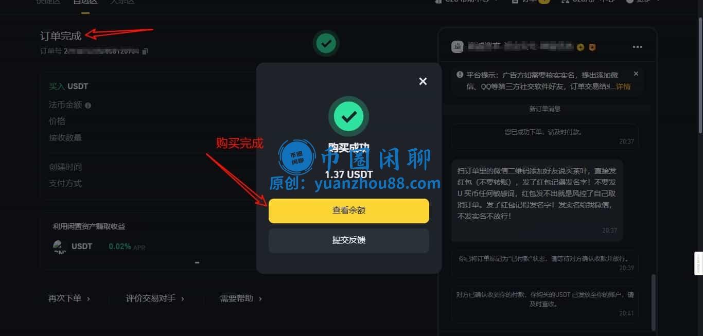 选择商家后,输入需要购买的数量并按提示完成付款,确认收款后,USDT将存入你的币安账户。