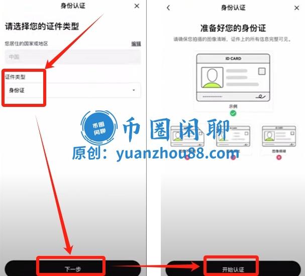 完成注册后,我们需要完成KYC认证即可开始正常使用。像中国大陆的用户,只需准备“身份证件”进行姓名、身份证号的填写并上传正反面照片即可。