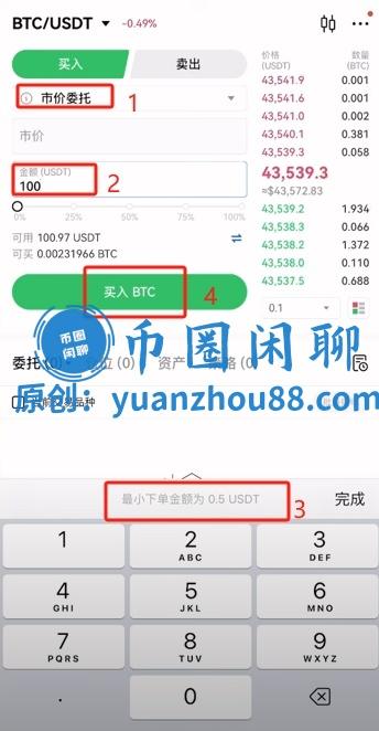 这里我以选择“市价委托”为例来演示一笔交易,比如购买100个USDT的比特币时,只需输入100即可。