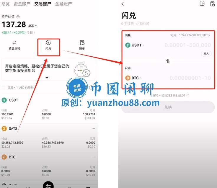 当您的交易账户中已有足够的U(如USDT)来购买比特币时,可以直接点击【闪兑】功能,该功能操作简便,只需输入您想兑换的U数量,系统便会立即将其兑换为比特币。但这种方式并不推荐,因为存在一定的损耗且兑换价格通常不佳;不过,如果您时间紧迫、急需立即获得比特币,仍可选择此方法进行操作,但建议只用于小额交易,大额的话还是通过下面的方法进行。