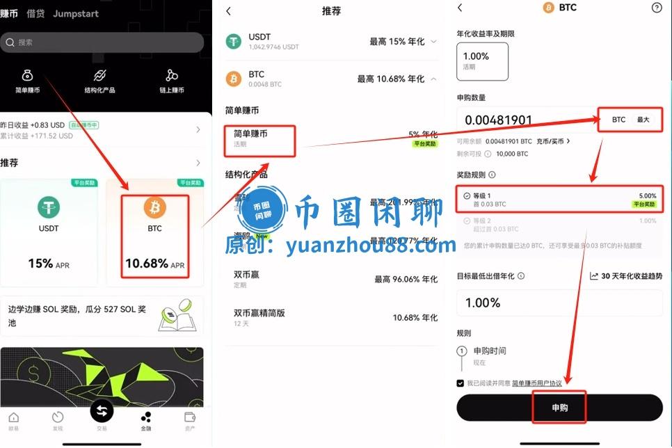 进入比特币页面后,依次点击【简单赚币】和【最大】,即可将全部比特币投入该项目;平台设定有补贴限额,仅对0.03个比特币提供年化5%的收益,而当前持有金额并未达到该上限,因此直接点击【申购】便完成了操作。