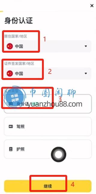 我们登录APP之后,会直接跳转到认证的页面。居住国家/地区选择【中国】,证件签发国家也选择【中国】,或者你也可以选择你的实际国籍。证件类型有三种,一个是身份证、一个是驾照、一个是护照。推荐大家使用【身份证】,点击【继续】。