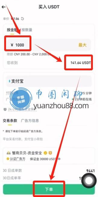 当我们需要购买1000人民币时,系统会自动计算出支付该金额将获得141.64 USDT,接着点击下方的【下单】按钮。