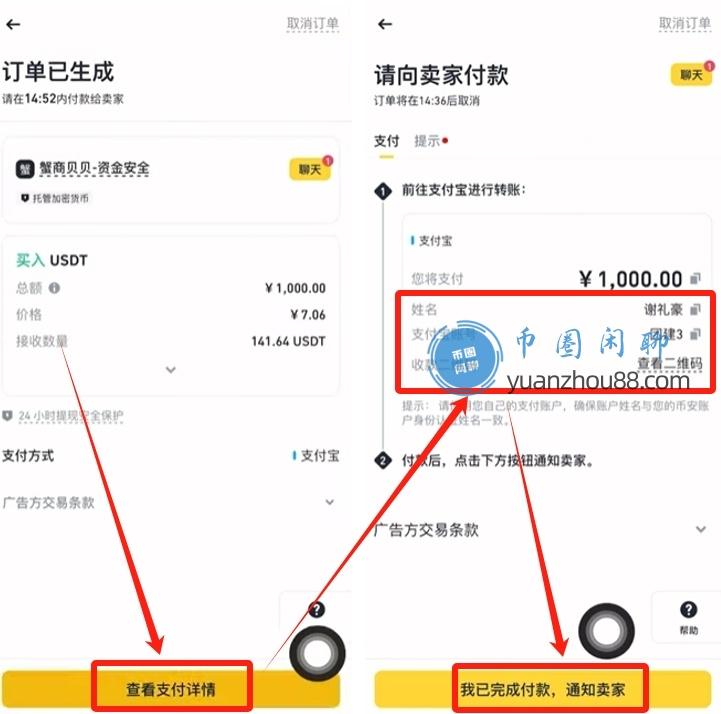 首先点击下方的【查看支付详情】,然后根据商家提供的支付方式进行转账。转账完成后,点击【我已完成付款,通知卖家】,等待卖家核实收款后,即可收到币。