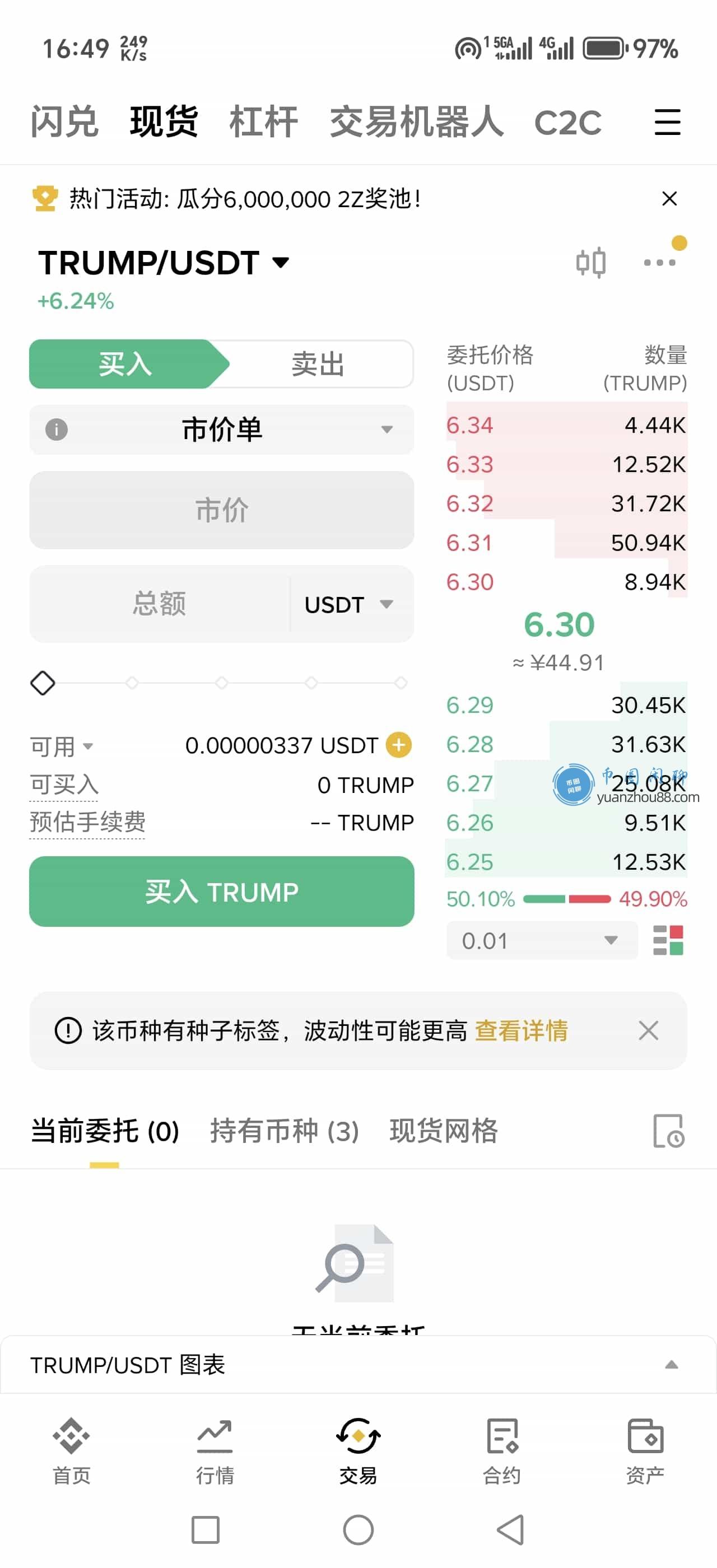 当您的账户中有了USDT后,返回App首页,点击【交易】-【现货】。在搜索框输入“TRUMP”或“TRUMP/USDT”,进入对应的交易对页面。