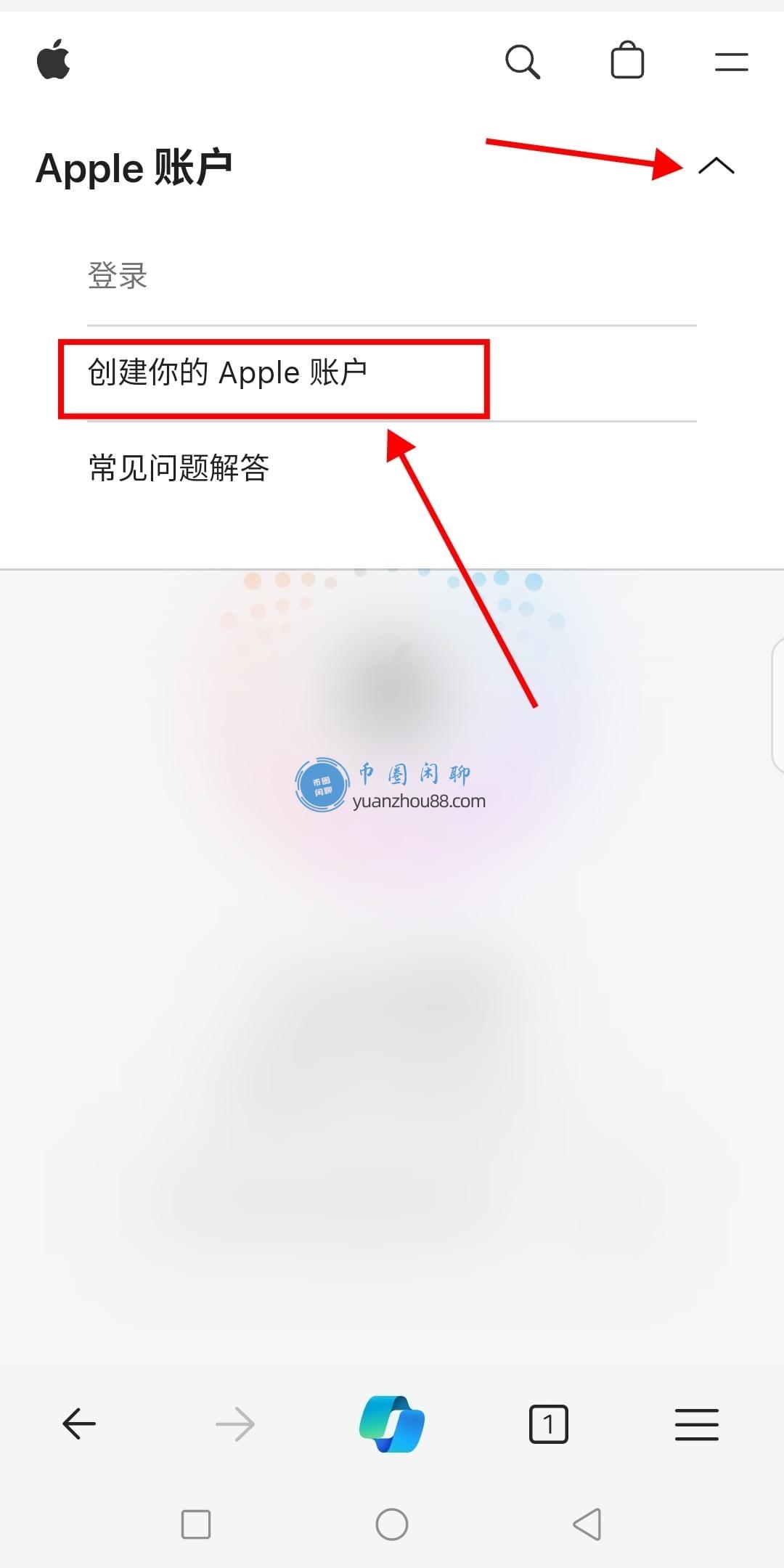 使用手机浏览器访问https://appleid.apple.com进入苹果官网账户页面,然后点击Apple账户右侧的下拉三角图标,选择”创建您的Apple账户”。