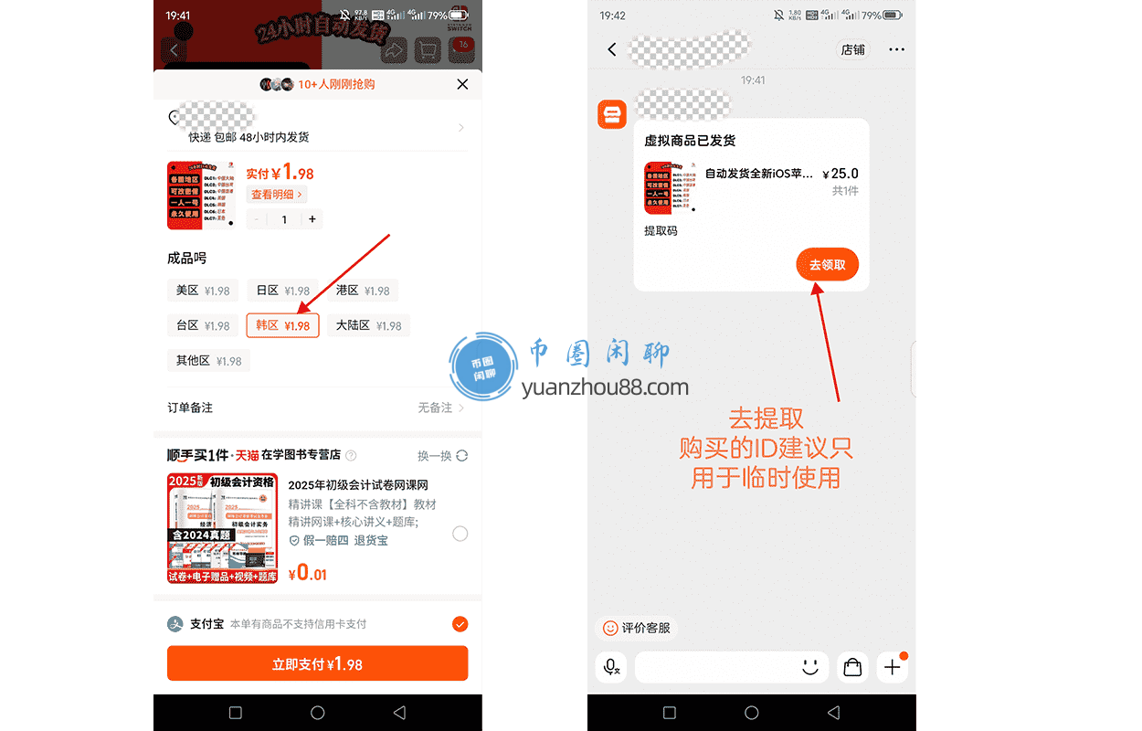 2. 在购买列表中选择韩国、新加坡或其他地区,但请勿选择香港和美国;点击“立即支付”完成支付后,商家会自动发货,您需在商家的聊天页面查看信息,并根据提示提取Apple ID。