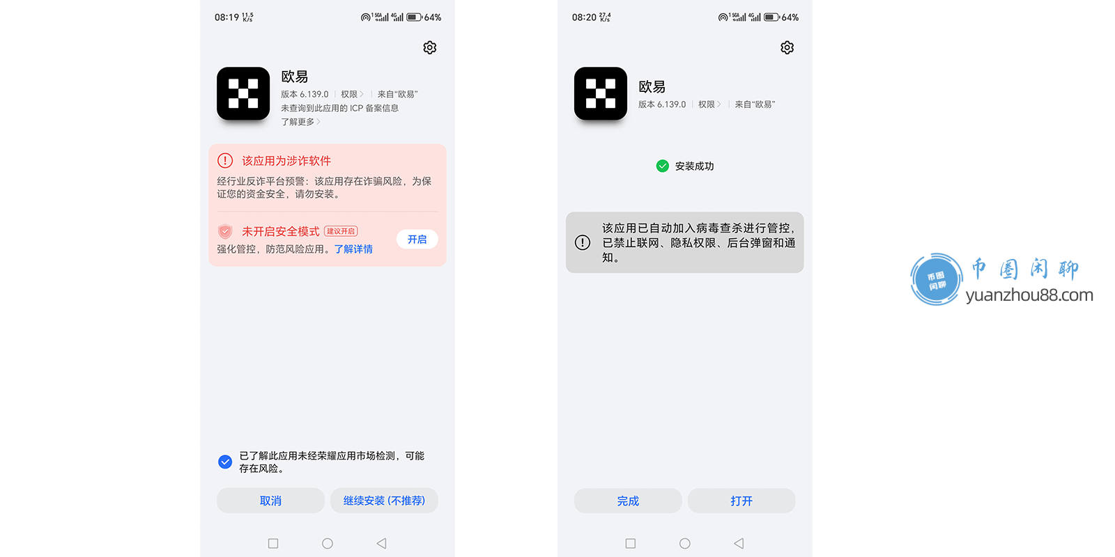 提示:国内部分安卓手机在安装时可能会提示风险,不让安装等情况;其实这是正常的,目前对于国内的环境来说,只要是欧易、币安之类的加密货币交易所都会这样报错。继续点击“无视风险继续安装”即可,如果是被禁止安装,可以把手机的网络断开,再次点击安装包进行安装就行
