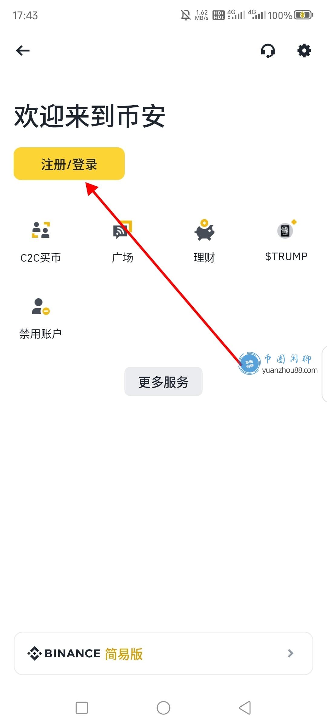 打开币安App后,请点击右下角的“注册/登录”按钮进入注册页面。