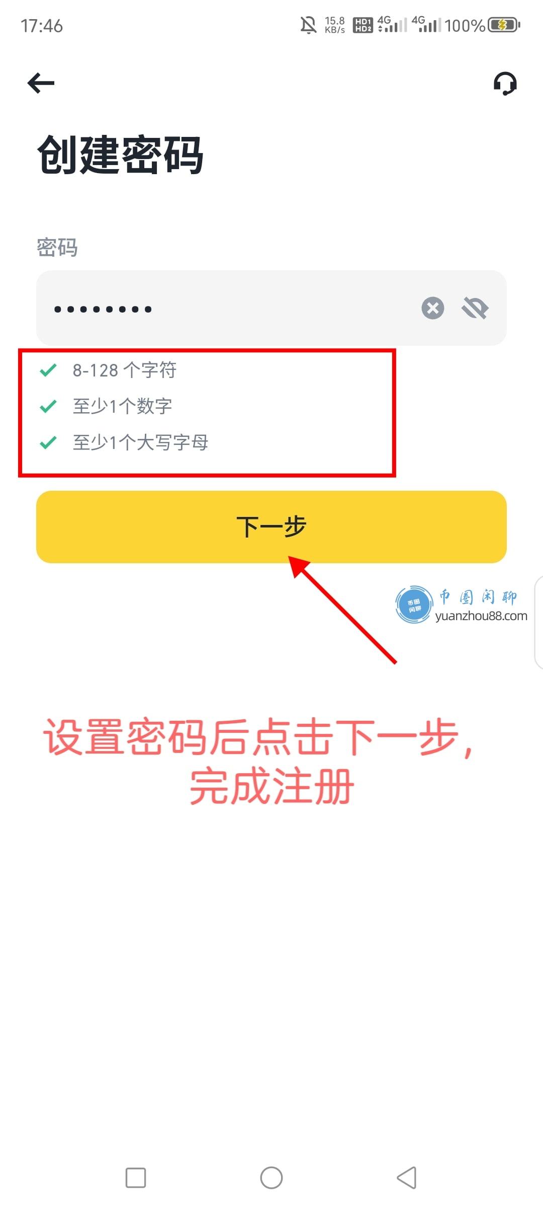 创建一个强密码,我们需要按照密码框下面的提示进行创建,8~128字符之间、至少1个数字、1个大写字母。