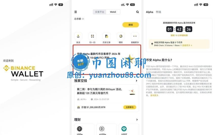 第一步:进入Alpha板块。在币安APP钱包页面,找到并点击“币安Alpha”选项。