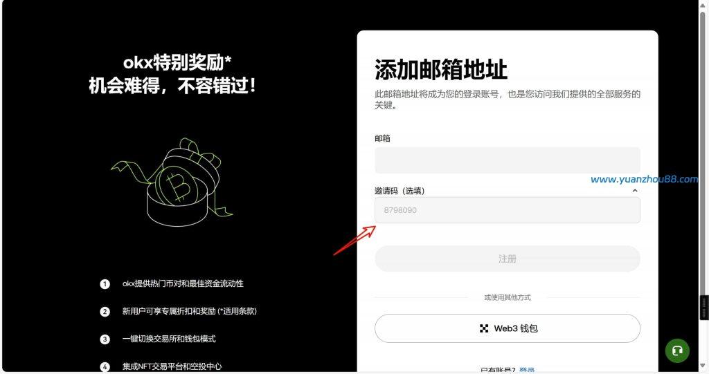 输入一个邮箱进行注册,下方有一个邀请码选填,我们可以把他点开,大家可以看到这里是邀请码8798090。如果你打开注册界面,这里没有邀请码的话,也可以手动填写上。