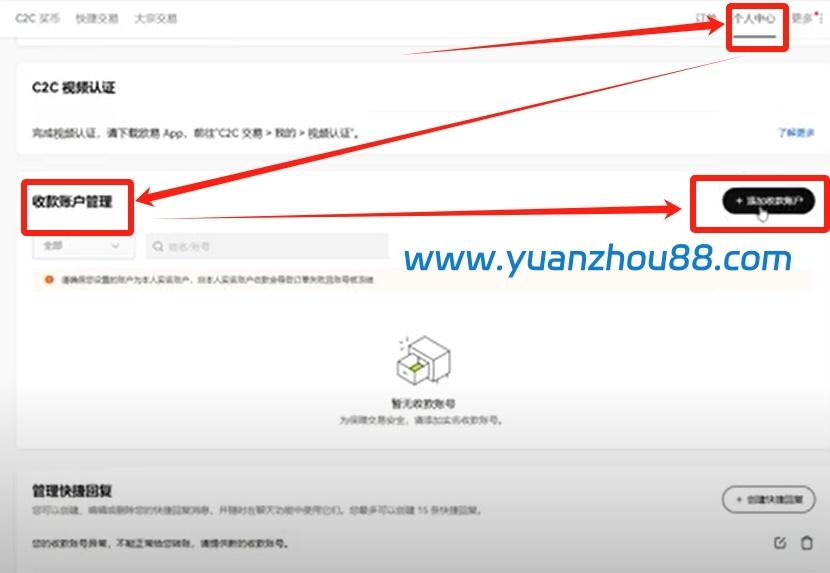进入平台后,我们会发现前期要求准备的邮箱、手机号、身份证及银行卡或微信支付宝支付方式中,支付功能尚未绑定启用。请点击右上角”个人中心”,下滑至”收款账户管理”区域,点击后方”添加收款账户”。