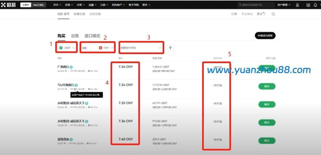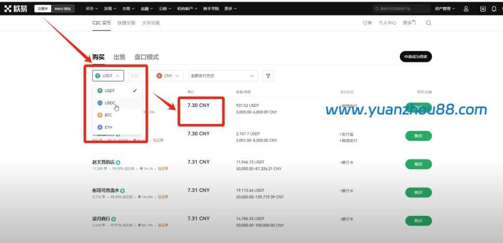 回到C2C买币页面后,我们需要开始购买USDT。页面顶部提供了币种选择选项,包括USDT、USDC、BTC和ETH。您可能会疑惑为何不直接购买比特币而选择USDT,其实USDT和USDC都是稳定币,它们均声称与美元保持1:1的锚定关系。当前USDT的购买价格与人民币兑美元汇率基本一致,这验证了稳定币的价值稳定性。