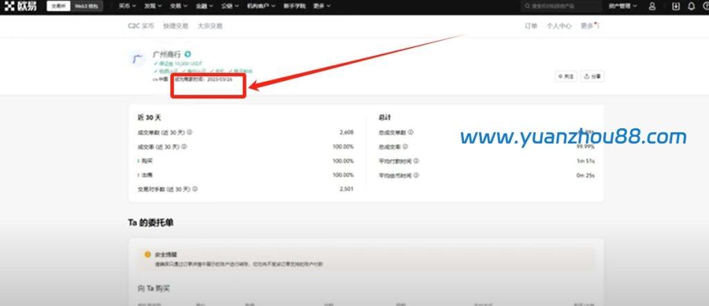 这些都是很重要的筛选标准,我们首先会根据成交单数和成交率进行初步筛选,例如要求商家至少拥有一万单以上的成交记录,且成交率需达到99%以上,这样的商家通常更为可靠。以“广州商行”为例,我们可以点击其名称查看其成为商家的时间,可以看到他已入驻超过一年;我们建议优先选择成为商家时间在半年以上的商家,因为他们在较长时间内未被黑钱问题困扰,这通常意味着其防范措施和账户安全机制较为完善。