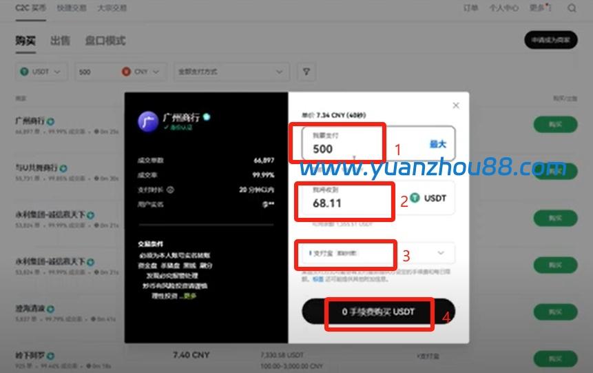 输入金额(例如500元人民币),下方将显示您可获得68颗USDT;您可选择支付方式(如支付宝、微信等),然后点击【0手续费购买】按钮。