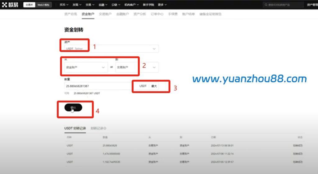 在上方选择资产时,选定 USDT 并设置从资金账户划转到交易账户的方向;如需反向操作,可点击中间的交换按钮切换,接着选中最大数量并点击【确认】,即可成功完成划转。