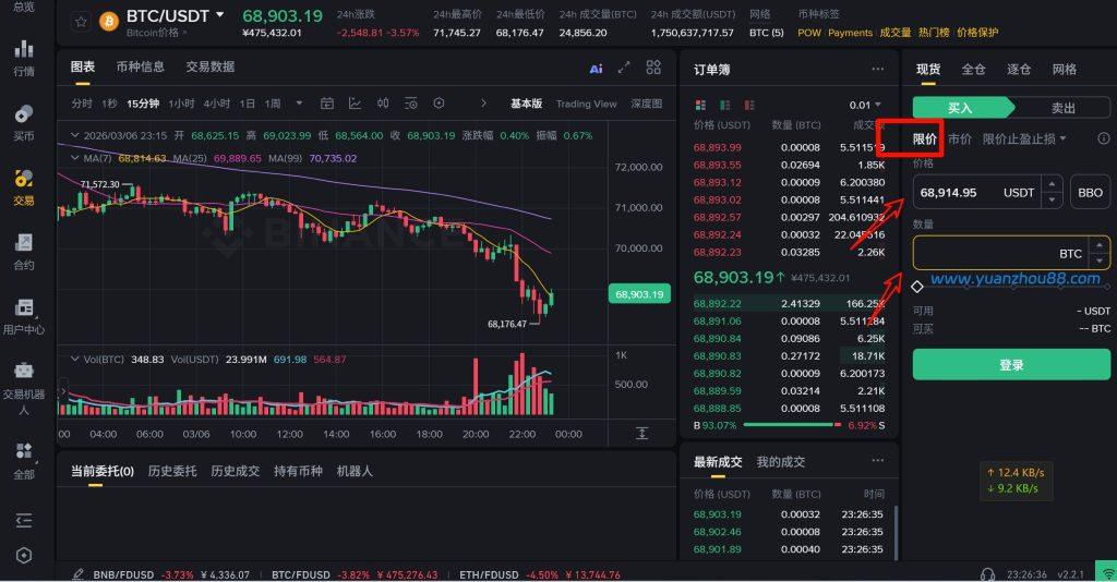 当您使用“限价委托”功能时,可输入理想的价格(例如当前市价为57810,若您认为该价格偏高并预期市场将下跌,则可设置55000),随后在数量输入框下方通过拖动滑块或直接输入USDT金额,点击【买入BTC】按钮即可成功创建限价委托单。