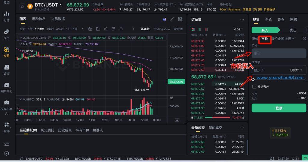 市价委托是一种以当前市场最优价格下单的方式,你不能更改价格,只需输入USDT的数量,系统便会自动以最优价格成交;例如,当你点击【买入BTC】时,订单会立即显示“下单成功”,不会产生挂单,如果该币种流动性充足时通常都能秒成交。