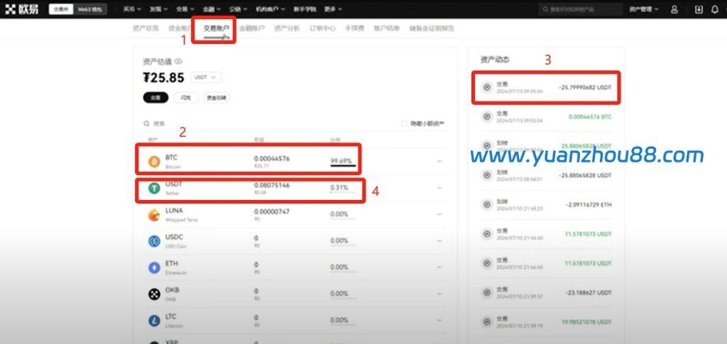 购买完成后,可以在交易账户看到我们刚才购买的比特币就在这里。右方也有我们的资产动态、交易的时间,25.799个USDT进行购买。剩下的USDT就还在下方这里,太少了没法买,这也是一个很常见的情况,大家不用过于担心。
