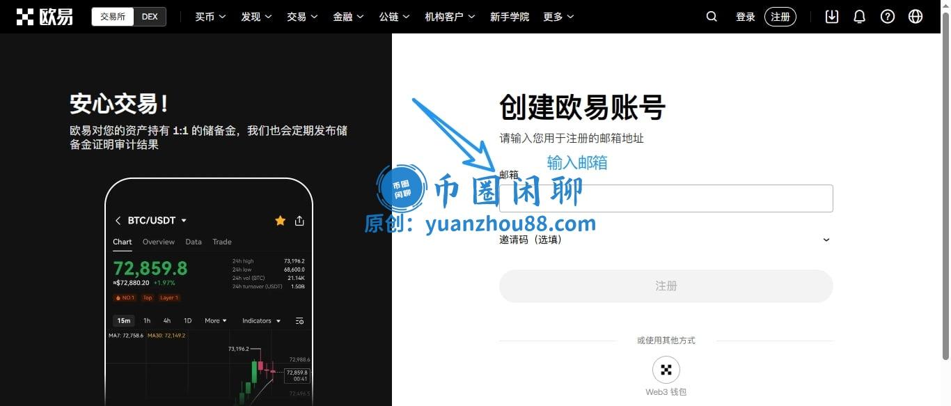 一、打开欧易交易所官网,在首页输入电子邮箱(如QQ邮箱、微软邮箱、网易邮箱或谷歌邮箱等),然后点击”注册”按钮。