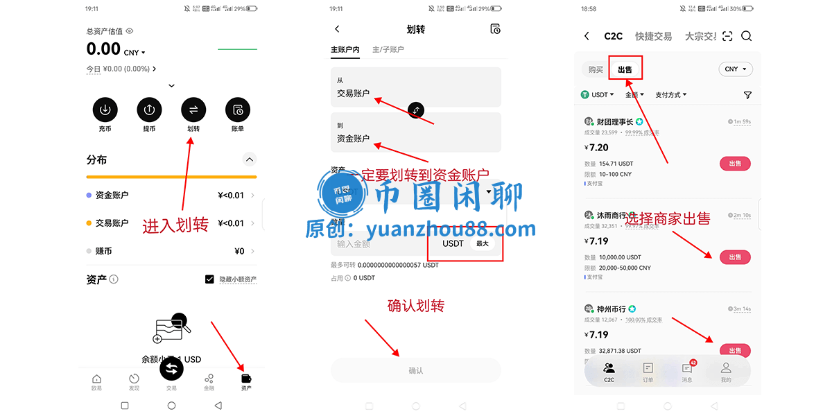 进入C2C交易页面之后选择“出售”,选你要卖的币种和金额,系统会匹配一个买家。买家把钱打到你的支付宝、银行卡或者微信,你确认收到款之后点击“确认收款”,平台就会把币放给买家。