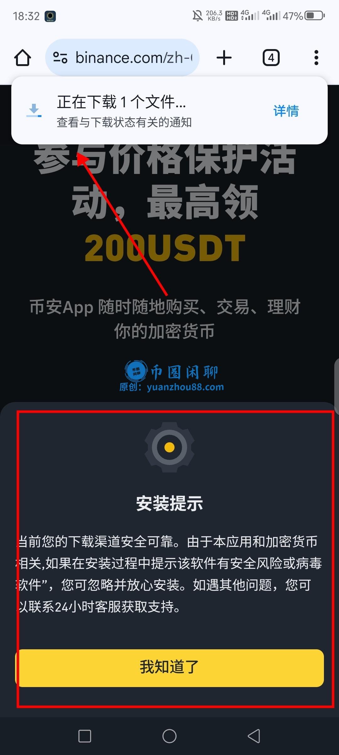点击下载按钮后,您将进入下载页面,选择“Android”或“APK Download”选项,浏览器随即开始下载币安APP的安装包(.apk文件)。